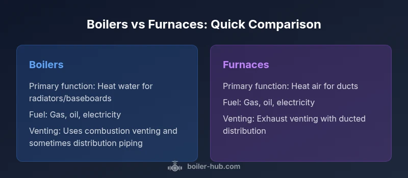 Are boilers and furnaces the same thing? \n\nAccording to Boiler Hub, the question are boilers and furnaces the same thing is a common misconception that can lead to mismatched expectations when planning a remodel or replacement. In practical terms, boilers and furnaces are two distinct families of heating equipment. They share the goal of delivering warmth, but they achieve it through different physical processes, design philosophies, and installation requirements. A quick sanity check: they are not the same thing, even though both are used to heat buildings. By the end of this article you’ll see how these differences translate into daily comfort, energy use, and total cost of ownership. This distinction matters for new installs, retrofits, and system upgrades alike.