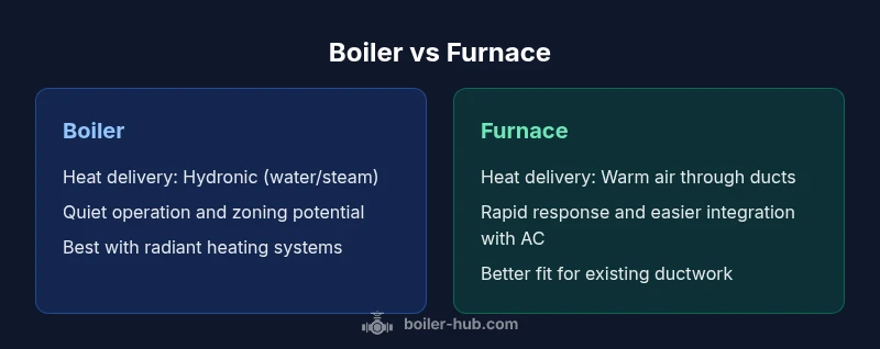 A boiler heats water to supply radiant heat or hot water, while a furnace heats air to distribute warmth through ducts. Boilers typically offer quieter, even heat with zoning options, whereas furnaces provide rapid space heating and easier integration with central AC.