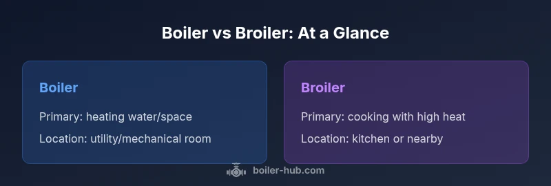 Boiler and broiler are not interchangeable terms. A boiler is a heating system that provides hot water or space heating, while a broiler is a cooking appliance used to apply high, direct heat to food. Clear terminology helps you avoid costly mistakes, misapplied equipment, and safety risks in both home and facility settings. According to Boiler Hub, many homeowners confuse these terms, leading to improper purchases or unsafe installations. This comparison lays out the essential distinctions to guide the decision.