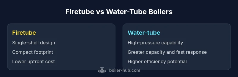 Understanding the fundamental differences between firetube and water-tube boilers is essential for any facility planning, retrofit, or new installation. According to Boiler Hub, the choice often reduces to how the steam is generated, how pressure is controlled, and how maintenance scales with demand. The Boiler Hub team found that while both designs produce steam efficiently, their physical layouts, operating envelopes, and best-use scenarios diverge in meaningful ways. In practical terms, a firetube boiler places hot gases inside tubes enveloped by water, delivering compact heat transfer with simplicity. A water-tube boiler fills the tubes with water and passes hot gases around them, enabling higher pressures and greater flow. The decision is not purely about fuel or price; it's about duty cycle, reliability expectations, and long-term operating costs.