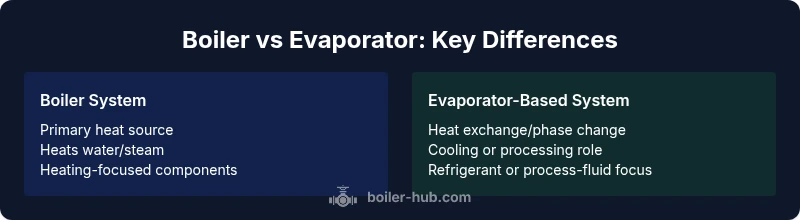 A boiler is a device designed to transfer heat to a fluid, typically water, to produce hot water or steam for space heating, radiators, or domestic hot water. In many homes, a boiler acts as the central heat source, converting a fuel or electrical input into thermal energy that is carried through pipes to heat exchangers or radiators. The key performance concerns for boilers include reliability, steam quality, and the ability to maintain safe operating pressure. In discussing terms like is a boiler the same as an evaporator, it helps to anchor the definition: a boiler’s primary function is to generate a usable heat carrier rather than to phase-change refrigerants or process fluids in a separate cycle. According to Boiler Hub, homeowners often conflate the terminology, which can lead to selection mistakes in both retrofit projects and new installations. A robust understanding of boiler types—hot-water vs. steam—and the typical fuel sources helps homeowners and facility managers choose equipment that matches their climate, demand profile, and energy strategy.