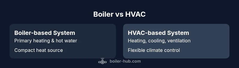 According to Boiler Hub, many homeowners and facility managers assume boiler and HVAC refer to the same thing. In reality, these terms describe different scopes. A boiler is a heat source that primarily generates hot water for space heating and domestic use. HVAC, short for heating, ventilation, and air conditioning, is a broader category that encompasses heating equipment, cooling systems, ductwork, controls, and air quality management. Recognizing this distinction is essential when selecting equipment, planning installation, and budgeting for energy efficiency. The Boiler Hub team emphasizes that mislabeling or misinterpreting these components can lead to mismatched equipment, higher operating costs, and comfort problems. Throughout this article we unpack the relationship between boilers and HVAC, with practical guidance for homeowners and facility managers. The results will help you decide whether your project requires a boiler-focused solution or a full HVAC approach, depending on climate, building type, and performance goals.