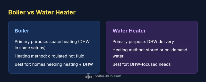 Understanding the distinction starts with definitions. A boiler is a heating appliance that heats a fluid (often water or a mix) to circulate through radiators or underfloor heating to warm a building. In many homes, that same boiler can also provide hot water for taps via a heat exchanger or indirect tank. A water heater, by contrast, is designed primarily to store and deliver domestic hot water for showers, sinks, and appliances. In short, boilers focus on space heating (and sometimes hot water), while water heaters focus on domestic hot water supply. According to Boiler Hub, the line between the two can blur in modern integrated systems, especially with combi or hybrid configurations. This nuance matters when selecting equipment, planning upgrades, or diagnosing a service issue.