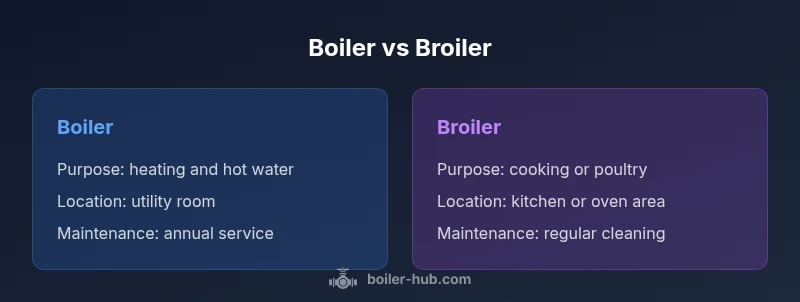 Boiler and broiler are distinct terms used in different settings. A boiler is a heating system or hot-water source inside a building, while a broiler refers to a cooking appliance or a live chicken prepared by broiling. The two words look and sound similar, which leads to confusion in home projects and manuals. Boiler Hub helps you distinguish them quickly by context, location, and function.