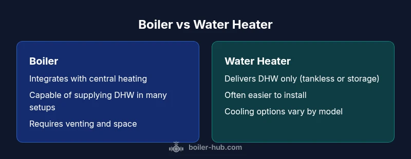 A boiler heats water for space heating and can supply domestic hot water in some configurations, while a water heater provides hot water for taps and appliances only. The choice depends on whether you also need heating and how you want to manage space and energy use.