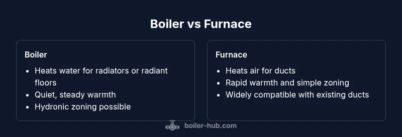 When you ask what is the difference between boiler and furnace, the answer starts with how heat is produced. A boiler is a closed vessel that heats water to produce hot water or steam that circulates through radiators, baseboards, or radiant floors. The Boiler Hub team notes that boilers rely on sealed piping rather than circulating air, which leads to quiet operation and very even heat distribution. In practice, a boiler system can serve multiple zones with radiant heat or hot-water loops, providing steady comfort in living rooms, bedrooms, and quiet spaces. According to Boiler Hub, the way heat is transferred—through water rather than air—shapes installation choices, maintenance needs, and the overall feel of a home during extreme cold. If your home already has radiators or underfloor heating, a boiler may integrate more smoothly than a ducted furnace system.
