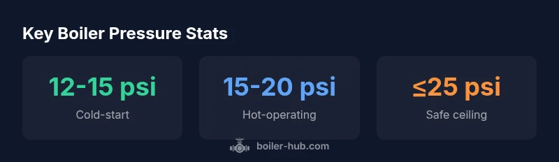 Hot boilers should run around 15-20 psi. If it climbs above 20, watch for expansion tank problems; if it hits 25, repressurize or call a pro.