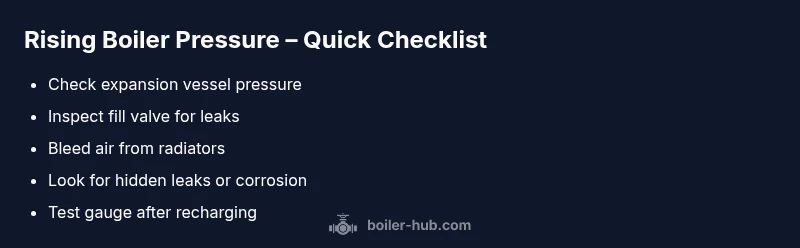 Most often, rising boiler pressure is caused by the expansion vessel losing its charge or a faulty fill valve allowing excess water into the system. Begin by testing the expansion tank air pressure, inspecting the fill valve and hoses for leaks, and draining a small amount of water to reset pressure. If pressure still climbs, power off and call a qualified technician.