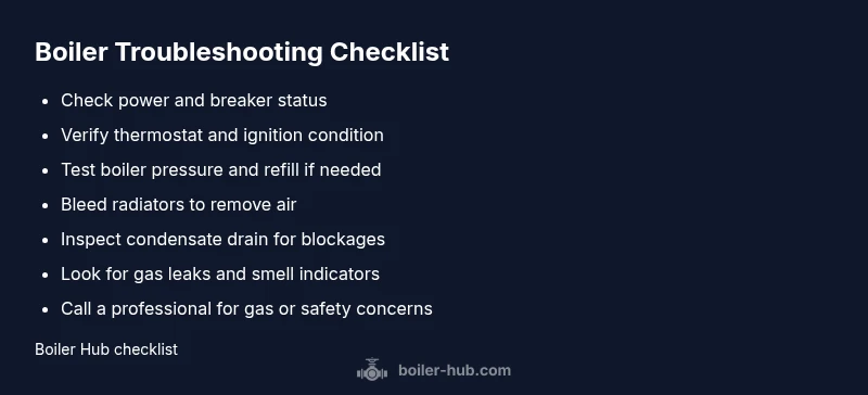 Most boiler outages stem from power, ignition, or pressure issues. A quick fix is to ensure the boiler is receiving power, reset the breaker if needed, verify the thermostat and pressure gauge, then bleed air from radiators if you hear banging. If these steps don’t restore heat, proceed with the diagnostic flow below.