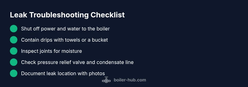 Symptoms guide the diagnosis. If you see steady dripping from a joint, the likely cause is an imperfect seal or loose connection; tightening or resealing can fix this in many cases. If water appears from a valve or pipe that is corroded, the diagnosis shifts toward component wear, requiring replacement. For pipes that crack from freezing or aging, the repair may involve replacing a section of pipe. If the leak continues after basic tightening, escalate to replacing gaskets, valves, or a segment of hot-water pipe. In all cases, never work on live gas lines or electrical components unless you are trained and authorized. When in doubt, consult a professional. Boiler Hub emphasizes safe handling and regular maintenance to prevent recurring leaks.