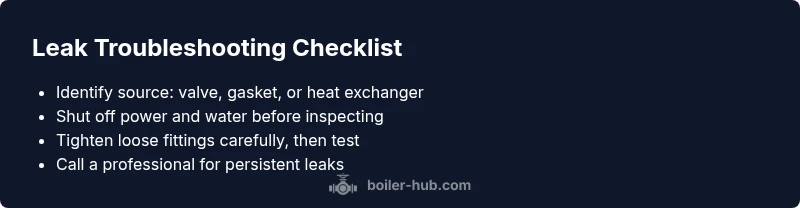 Discover the common causes of boiler water leaks and follow a structured troubleshooting flow to diagnose and fix safely. Learn how to identify leaks from relief valves, seals, heat exchangers, and more with Boiler Hub.