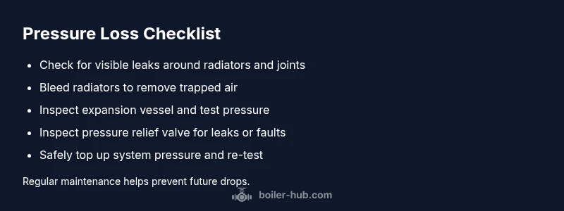 Most likely cause of sudden pressure loss is a leak in the system or a faulty expansion vessel. Quick fixes: check for visible leaks around radiators, pipes, and the boiler; bleed air from radiators to restore pressure; if needed, top up to the recommended level and monitor. According to Boiler Hub, persistent drops after these steps require a professional inspection.