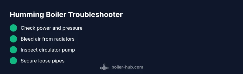 A humming boiler is typically caused by the circulator pump or air in the system. Start with power, pressure, and leaks, bleed if needed, and check the pump before calling a pro.