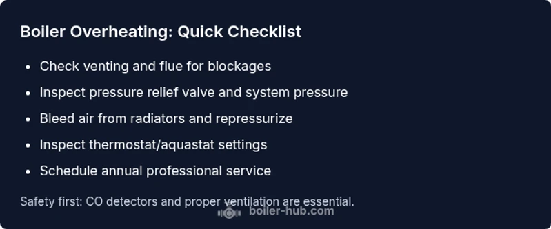 Boiler overheating is usually caused by restricted venting, a faulty pressure relief valve, or a stuck thermostat. Begin with safety: turn off the boiler at the switch, then let it cool. According to Boiler Hub, start with the simplest checks—air vent, pressure, and clean the heat exchanger before calling a pro.