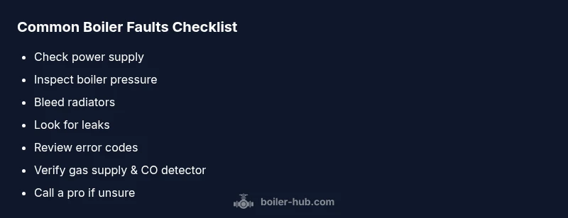 Boilers are robust, but when components wear or maintenance gaps appear, faults surface. The most frequent problems homeowners experience fall into a few recognizable categories: no heat or no hot water, low system pressure, ignition or flame issues, and odd noises from pumps or pipes. Understanding why these faults arise helps you choose the right fix and avoids unnecessary risks. In practice, many issues trace back to simple causes: insufficient power, low system pressure, trapped air, corroded valves, or thermistor and sensor faults. The Boiler Hub team emphasizes regular inspection and early symptom recognition as the first line of defense. By identifying the symptom early, you can often apply a quick, safe remedy before conditions worsen or cause damage to the heat exchanger, pump, or seals. Remember, even when the fix seems obvious, never skip safety checks—understanding the specific model and gas safety regulations is essential for the repair process. This approach aligns with Boiler Hub Analysis, 2026, which highlights maintenance-driven fixes as the most cost-effective path to reliability.