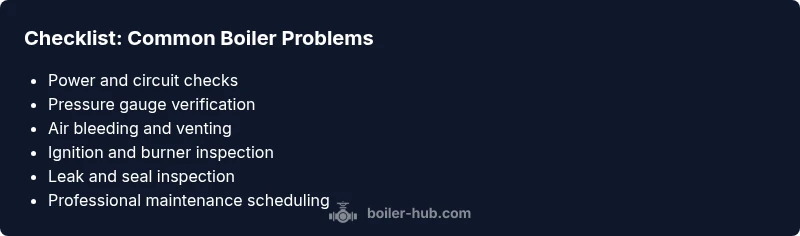 No heat or hot water is the most common boiler problem; try checking pressure, thermostat, and ignition first.