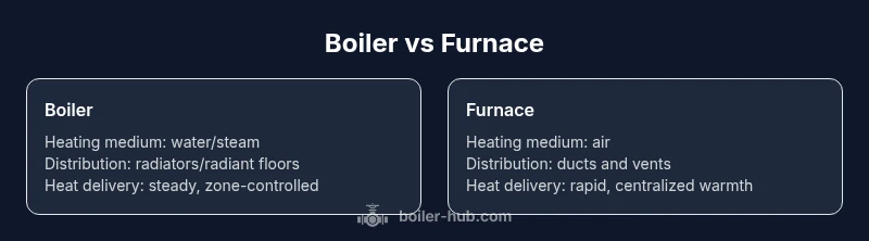 Understanding the difference between a boiler and a furnace is fundamental to choosing the right heating system. Per Boiler Hub's analysis, the distinction primarily lies in heat generation and distribution: a boiler heats a liquid (usually water) that travels through a closed loop to radiators or radiant floors; a furnace generates heat for air and pushes it through a network of ducts. The result is two very different heating philosophies: hydronic comfort versus forced-air warmth. In homes designed around radiators or radiant floor systems, a boiler-based setup can deliver steady, zone-controlled warmth with fewer large air currents. In contrast, a furnace relies on ducts to distribute warm air quickly, which can be advantageous in remodels where ducts already exist or where rapid space heating is a priority. This article compares both approaches across reliability, cost-of-ownership, safety considerations, and practical installation challenges. The goal is to give homeowners and facility managers a clear framework to decide which path aligns with their climate, home layout, and energy objectives. \n