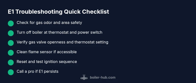 Error E1 on a boiler usually means a flame failure or sensor fault, and it demands immediate attention. E1 can trigger lockout and loss of heat. Quick fixes include resetting power, checking the gas supply and pressure, and ensuring the thermostat is set correctly. According to Boiler Hub, if the E1 code persists, shut down the boiler and call a qualified technician to inspect the control board and safety devices.