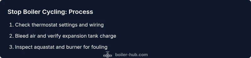 To stop boiler cycling, identify the root cause and fix it safely. Start by checking thermostat placement and wiring, verify system pressure and expansion tank state, bleed air from radiators, and inspect the aquastat and heat exchanger for fouling. If cycling persists after these checks, contact a qualified technician. This approach minimizes short cycling and improves comfort.