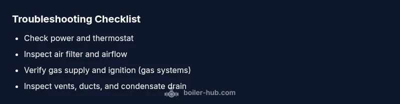 This flow helps you map symptoms to probable causes and actions. If there is no heat, start by confirming power and thermostat; if these are normal, check the air filter and airflow, then inspect the gas supply and ignition if applicable. If the unit runs but cycles on and off, suspect thermostat calibration or short-cycling due to overheating. If heat is intermittent, inspect ductwork for leaks or closed dampers. For each symptom, Boier Hub suggests a progressive approach: confirm, test, replace or reset, and re-test. Document any error codes from the control board to speed up professional diagnosis.