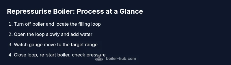 Repressurising involves a few controlled actions rather than a race against time. Start with safety checks, then access the filling loop, carefully add water, and watch the gauge move toward the target range. Close the loop promptly to avoid overfilling, then re-run the boiler to verify the reading. If you must bleed air from radiators, do so in small increments while monitoring pressure. Finally, inspect for leaks and verify that the system is balanced after the heating cycle. This section provides context; the formal steps are provided in the dedicated step-by-step block, which adheres to best-practice safety guidelines.
