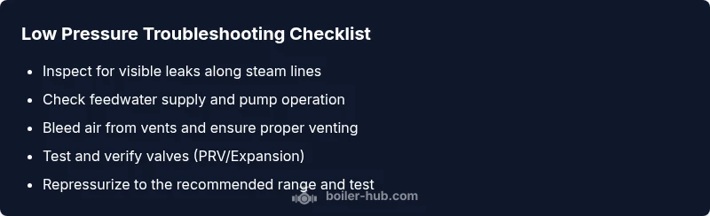 Low pressure on a steam boiler means the system is not building or sustaining adequate steam pressure for heating demand. In a properly functioning boiler, pressure should rise when the burner starts and hold within the safe operating range until the demand ends. When the gauge reads below the expected range, you may experience slower heat response, reduced steam output, and longer cycles. According to Boiler Hub, addressing low pressure promptly reduces the risk of air binding, primer issues, and inefficient fuel use. The Boiler Hub team finds that many low-pressure scenarios stem from simple, fixable issues rather than catastrophic failures. Why this matters: steam systems rely on a precise hydraulic balance; even small pressure drops can cascade into performance losses and higher fuel costs. Prioritizing a methodical approach helps you isolate causes faster and minimize downtime.