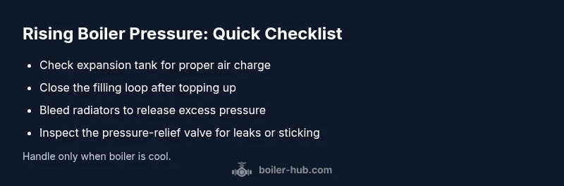 According to Boiler Hub, rising boiler pressure is most often caused by improper absorption of water expansion during heating. When the water heats, it expands and increases pressure if the system's expansion resources are compromised. Common culprits include a failed expansion tank, a malfunctioning pressure-relief valve, or a closed filling loop that was opened during recent service. Leaks in the loop or radiators can also drive pressure up as fresh water adds volume. Understanding these dynamics helps homeowners act quickly and safely. If you notice the gauge climbing steadily as the boiler heats, treat it as a warning sign and proceed with measured checks rather than improvising fixes. The Boiler Hub team emphasizes safety and methodical diagnosis to prevent costly damage.