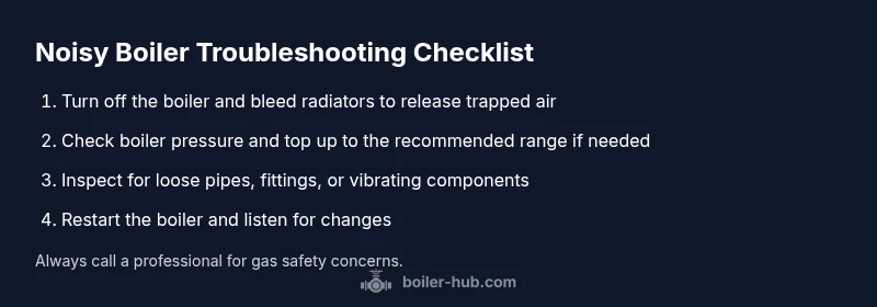 Most loud noises are caused by trapped air. Steps: 1) Power off and let the boiler cool. 2) Bleed radiators starting from the highest radiator, collecting water in a container. 3) Recheck and adjust boiler pressure to the recommended range. 4) Restart and listen; if noise reduces, monitor for recurrence. 5) Inspect visible fittings for looseness and tighten carefully. 6) If the noise persists, seek professional help to inspect the heat exchanger and pump.
