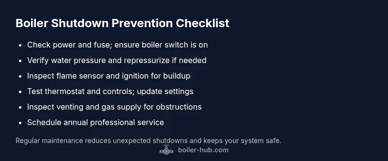 When homeowners ask, "why does boiler keep turning off," the answer often lies in a few predictable categories. Most shutdowns stem from a safety limit being reached or an efficiency fault, not from a simple malfunction. In Boiler Hub's experience (Boiler Hub Analysis, 2026), the most frequent culprits are low water pressure, a dirty or failing flame sensor, and overheating that trips the safety limit. Understanding these core causes helps you prioritize checks and avoid costly service calls. You’ll find that many shutdowns resolve after a quick sensor clean, a pressure check, or a reset. As you work through the steps, keep in mind that persistent cycling deserves professional attention to prevent equipment damage and ensure safe operation.