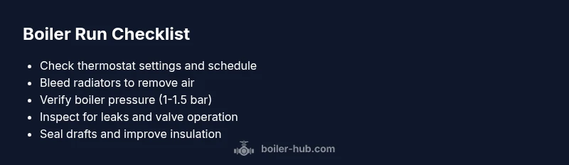 According to Boiler Hub, a boiler that runs excessively is usually signaling that heat is being wasted or demanded continuously. The root causes often sit at the edge of simple maintenance: thermostat settings, control wiring, or pressure that keeps the system cycling. Understanding how your home loses heat and how the boiler responds helps you pick the right fix. In many homes, the first step is to verify the basics: is the thermostat set correctly, are the radiators bleeding, and is the boiler pressure in the normal range? This quick check can save time and prevent bigger problems down the line. Boiler Hub's analysis shows that many cases come down to a few predictable culprits: over-demanded heat calls, insufficient insulation, and small mechanical faults that compound over time. Turning down the heat on unused zones and ensuring doors and windows are well sealed can dramatically reduce unnecessary runtime. If your boiler is older or oversized for the space, it will tend to run more than necessary.