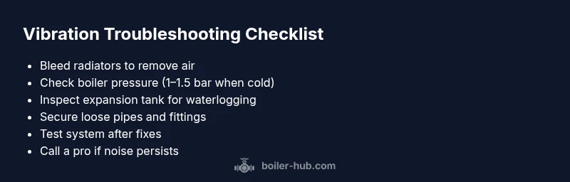 To avoid trial-and-error guessing, follow this concise flow: (1) Is there a gas odor or ignition issue? If yes, evacuate and call emergency services. (2) Check pressure and bleed air if needed. (3) Listen for water hammer; if present, focus on pipe supports and air removal. (4) Inspect expansion tank and pump for signs of wear. (5) If vibration persists after these steps, schedule professional service for a deeper check (impeller wear, motor bearings, or control valve issues).