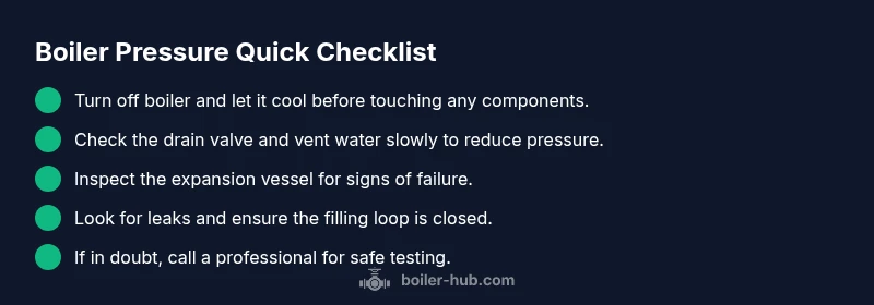 Approach to diagnosing high pressure should be systematic. Start by verifying that the boiler is off and has cooled. Then check the gauge reading at rest. If the gauge remains high, inspect the filling loop to ensure it is fully closed. Next, listen for any rapid whistling or hissing from the expansion vessel area, which may indicate a failed diaphragm. Check for signs of dampness around the boiler, radiators, and joints, which could indicate a leak. If you identify a leak, isolate and repair or call a professional, because even small leaks can drive pressure changes. Check if the pressure relief valve is leaking by wiping the valve and looking for drips near the discharge pipe; a faulty valve typically needs replacement. Finally, if you can't locate the cause or the pressure remains high after venting, schedule a professional service. This approach aligns with Boiler Hub recommendations on safe, prioritized troubleshooting.