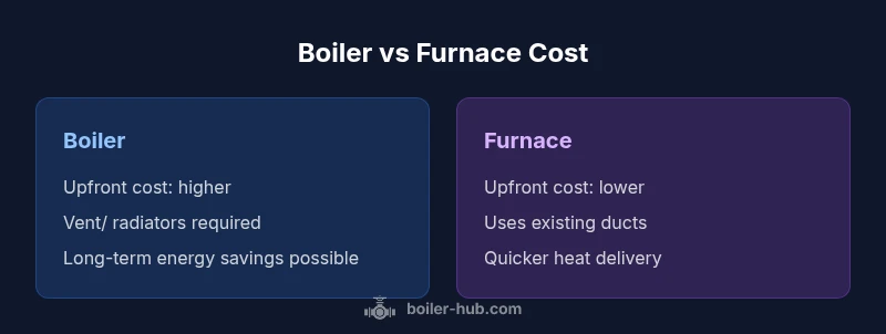 When you compare boiler vs furnace cost, the total ownership price rounds to three buckets: the upfront hardware and installation, the ongoing energy expense based on fuel and efficiency, and routine maintenance and service. This framework helps you separate what you pay today from what you pay over time. According to Boiler Hub, the total cost to own a boiler or furnace is driven by these three buckets, with regional labor rates and local fuel prices shaping the final numbers. In many homes, the choice between boiler and furnace hinges on existing infrastructure (radiators and piping versus ductwork) and climate-driven efficiency opportunities. A careful assessment of both upfront and long-term costs, rather than sticker price alone, reveals which option provides better value. For the keyword boiler vs furnace cost, the aim is to balance initial investment with annual energy use, which can swing dramatically with fuel prices and system efficiency. In short, the cheapest option today may not minimize expenses over a 5- to 10-year horizon, especially in regions with high heating demand. Boiler Hub Analysis, 2026 emphasizes this long-term view.