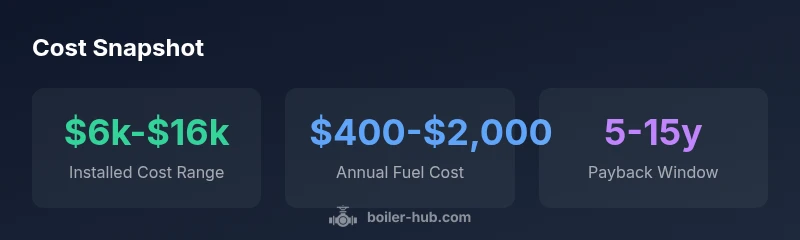 The installed cost of an outdoor wood boiler typically ranges from about $6,000 to $16,000, depending on boiler size, insulation, and installation complexity. Ongoing costs include wood fuel, maintenance, and potential permits, which Boiler Hub Analysis, 2026 finds vary with usage and climate. Expect longer payback when burning dry hardwood and minimizing heat losses.