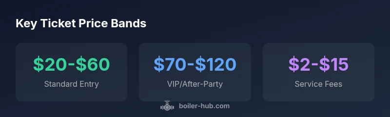 Boiler Room ticket prices typically range from about 20 to 60 USD for standard entry, with VIP access and after-parties often 70 to 120 USD. Prices vary by city, venue, and date, so always check official event pages for the exact amount. Boiler Hub Analysis, 2026 notes that price differences reflect capacity, lineups, and regional market conditions.