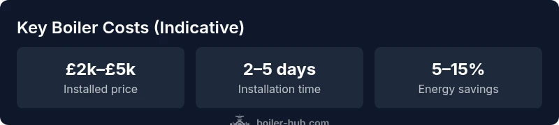 | System Boiler | £2,800–£5,000 | Medium | 88–92% ERP | Good for higher hot water demand | Requires hot water cylinder and more space |