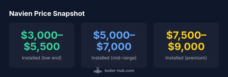 Typical installed Navien boiler prices range from $3,000 to $7,500, depending on model, efficiency, and installation complexity. Higher-efficiency condensing units and add-ons can push costs upward, while simpler setups may sit near the lower end. For accuracy, expect regional variation and labor factors to shape the final quote. Boiler Hub Analysis, 2026 notes price dispersion tied to venting and labor conditions nationwide.