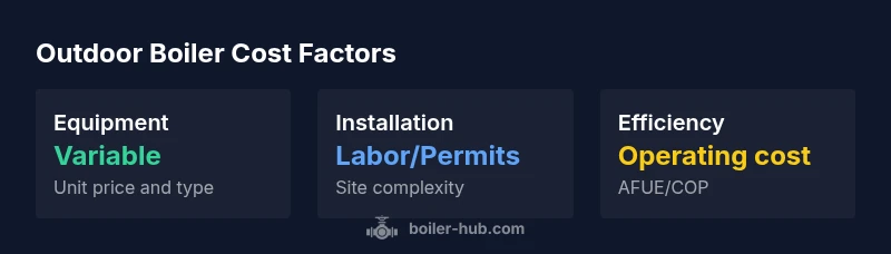 Understanding outdoor boiler cost means looking at the complete price tag: the boiler unit itself, delivery, site preparation, installation, venting, and any required accessories such as heat exchangers, controls, and insulation. In many regions, permits and inspection fees add to the upfront expense. According to Boiler Hub, the total price often reflects not only the equipment but also the complexity of the install, local code requirements, and labor rates. Homeowners should budget for both the equipment and the contingencies that appear during site prep, such as trenching for fuel lines, or upgrading electrical service. A well-planned project can reduce surprises and help you compare apples to apples when you request quotes.