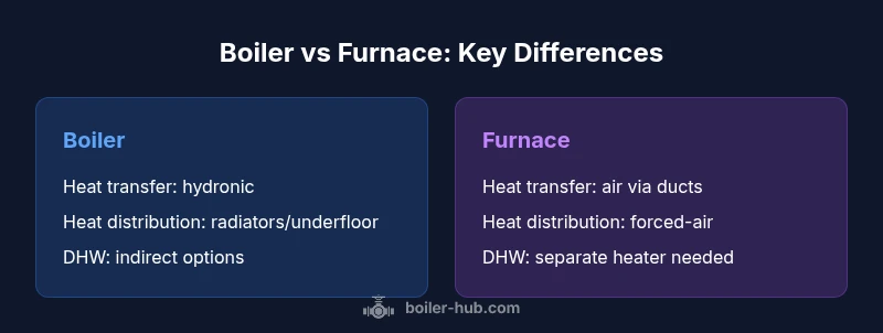 Boiler versus furnace choices hinge on how heat is produced and distributed in your home. A boiler heats water for radiant or hydronic systems, while a furnace heats air via ducts for rapid room warming. The Boiler Hub Team recommends weighing climate, insulation, and domestic hot water needs to decide which path suits you best.