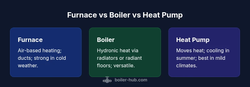 Furnace vs boiler vs heat pump: the right choice depends on climate, energy costs, and home design. According to Boiler Hub, no one system fits every home; the best approach is to match the heating method to your priorities—cost, comfort, and future upgrades. In practice, many homes benefit from hybrid setups or zoning.