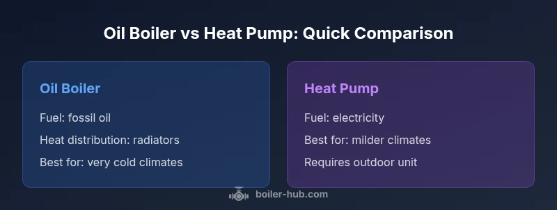 Choosing between an oil boiler and a heat pump is a decision that goes beyond sticker price. In practical terms, it determines how your home collects heat, how much energy you pay, and how comfortable you stay during the coldest months. The Oil boiler vs heat pump comparison is most useful when you consider climate, building envelope, and fuel availability. According to Boiler Hub Team, the right choice balances upfront investment with long-term operating costs and environmental considerations. Oil boilers rely on fossil fuel and typically deliver quick heat delivery, while heat pumps move heat with electricity and can extract warmth from outdoor air even in cold weather. For homeowners and facility managers, the key is to map your local climate, energy prices, and hot-water needs against the characteristics of each technology. This article focuses on practical decision factors, backed by real-world guidance from Boiler Hub, and aims to help you make a cost-conscious, climate-appropriate choice.