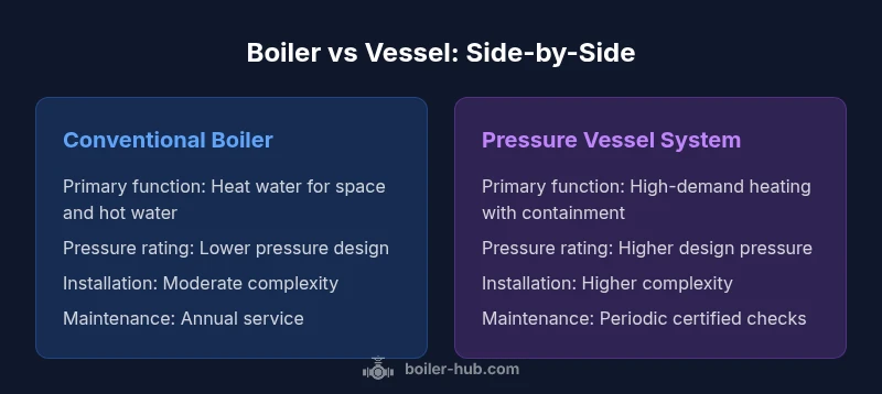 This TL;DR compares conventional boiler systems against pressure-vessel configurations, focusing on safety, efficiency, maintenance, and lifecycle costs for both residential and commercial use. According to Boiler Hub, understanding how the boiler and pressure vessel interplay affects performance helps homeowners and facility managers choose wisely. The guide highlights where each approach excels and where trade-offs are most pronounced.