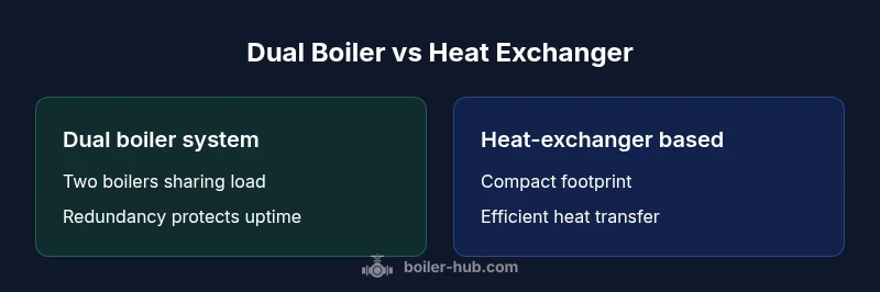 In modern heating design, the phrase dual boiler vs heat exchanger refers to two distinct architectural approaches for producing hot water and space heating. A dual boiler setup uses two separate boilers to share load and provide redundancy so that hot water delivery remains uninterrupted during maintenance or a fault. A heat exchanger–based design, by contrast, relies on a heat exchanger to transfer heat from a primary energy source to a secondary circuit that serves radiators and taps. According to Boiler Hub, the choice between these approaches is influenced by how a building uses energy, how frequently peak heat is demanded, and what owners are willing to invest upfront and over time. The Boiler Hub team notes that both options can deliver reliable comfort when properly sized and controlled, but the operational implications can be quite different. This article breaks down the differences with practical criteria that homeowners and facility managers can use to gauge fit, including load profiles, zoning needs, and maintenance implications. By walking through design logic, we illuminate whether the dual boiler vs heat exchanger decision should tilt toward redundancy or compact efficiency.