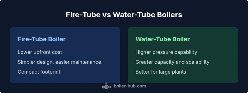 Fire tube vs water tube boiler: in most mid-sized plants and many homes, the choice hinges on pressure, capacity, and maintenance needs. Fire-tube models are typically simpler, cheaper up front, and easier to service for lower pressures, while water-tube designs excel in high-pressure, high-capacity applications. According to Boiler Hub, the right choice depends on capacity, operating pressure, and maintenance strategy.