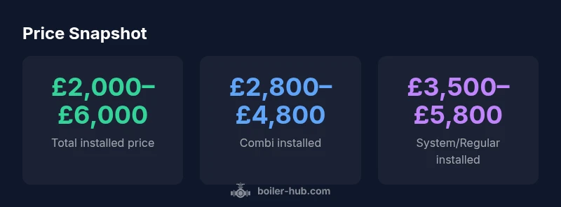 | Combi boiler (installed) | £2,800–£4,800 | 24–30 kW |
